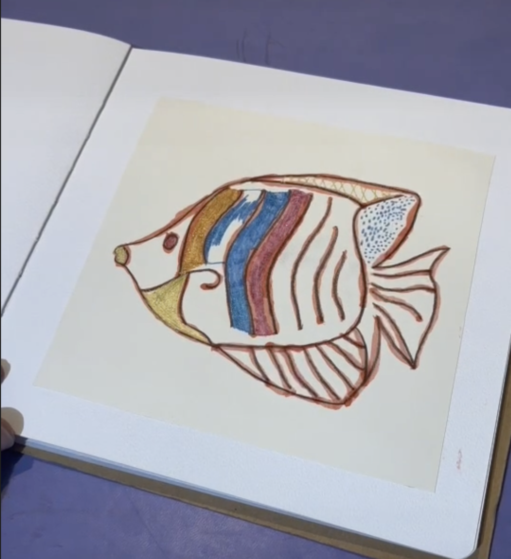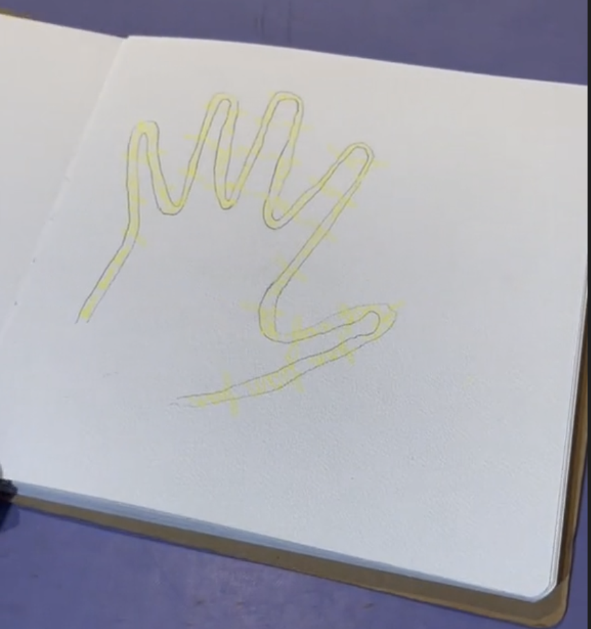 Chacun prend son carnet, qui avait été personnalisé en amont avec leur prénom calligraphié dessus. Le premier dessin réalisé est la forme de leur mains dédoublé de l’intérieur, formant un interligne qu’ils rempliront avec la couleur de leur choix.